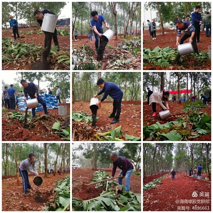 為將結對共建落到實處,第一黨支部結合當前基地分公司正在開展膠園冬春管理工作的實際,與豐收隊黨支部共同商定開展“結對共建同進步 義務獻肥促冬管”主題黨日活動。在海墾集團黨委委員、副總經理,海南橡膠黨委書記、董事長艾軼倫等黨員帶領下,支部黨員積極響應號召,自發捐款3400元購買羊糞生物有機肥,并施放到豐收隊的橡膠林段,為明年橡膠增產增收貢獻綿薄之力。