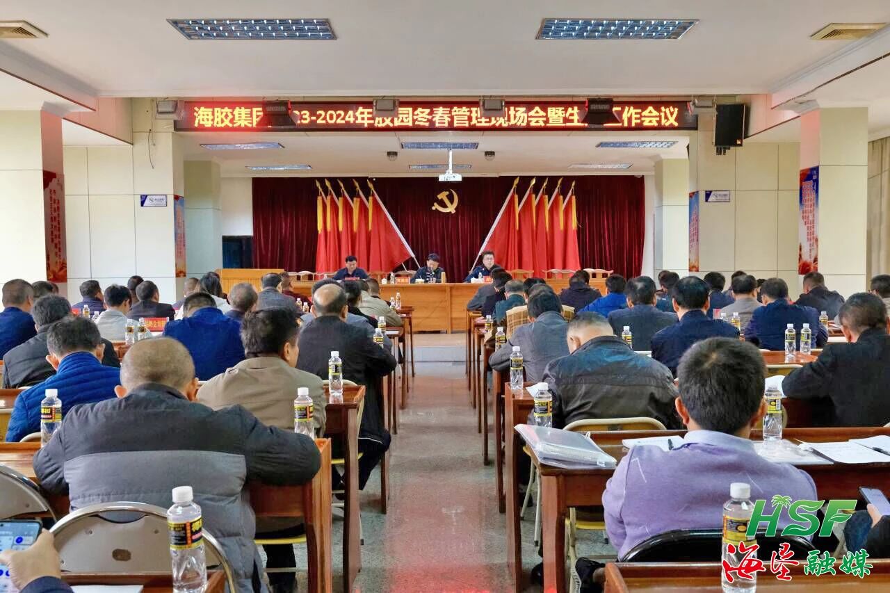 12月22日,海南橡膠2023-2024年膠園冬春管現場會暨生產工作會議在山榮分公司召開,海南橡膠黨委委員、副總經理黃廉宏出席會議并作部署講話,總部相關負責人,以及25家基地分公司、種苗分公司總經理、分管生產工作副總經理及生產部長等共100余人參加會議。
